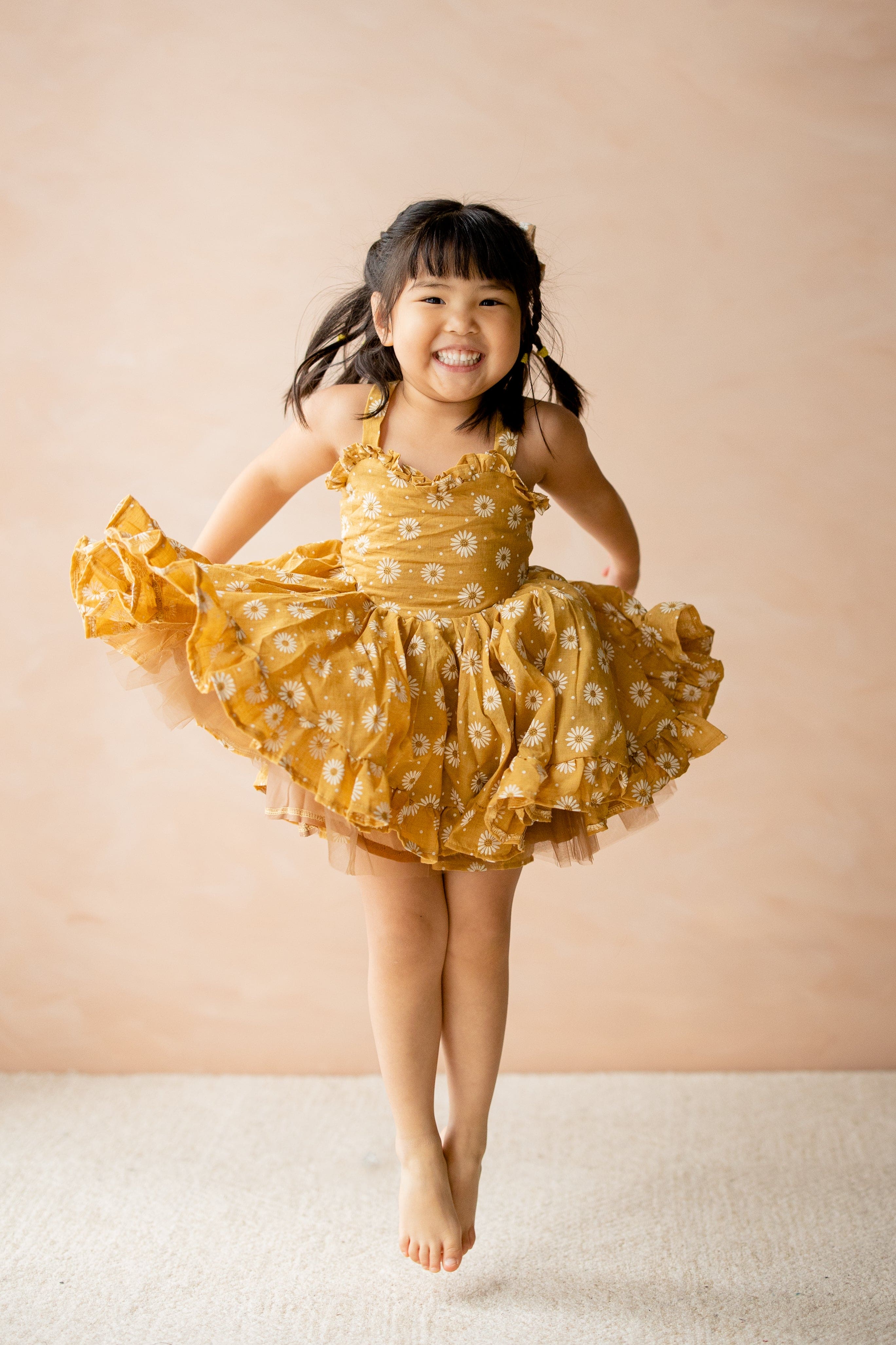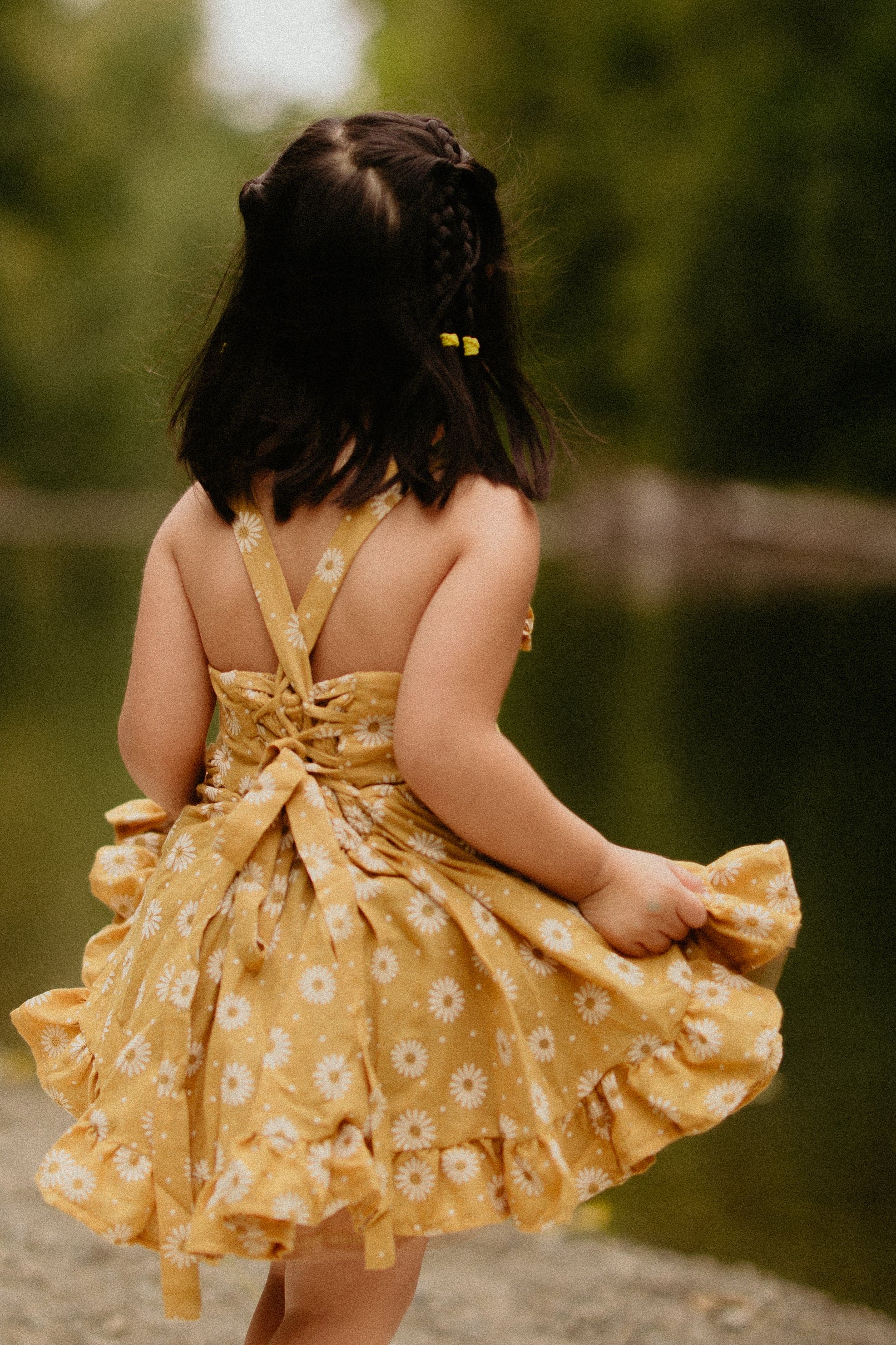 This is the kid's version of the Mustard Daisy Fable Dress! Now open for pre-orders. Turn around is about 4-5 weeks.